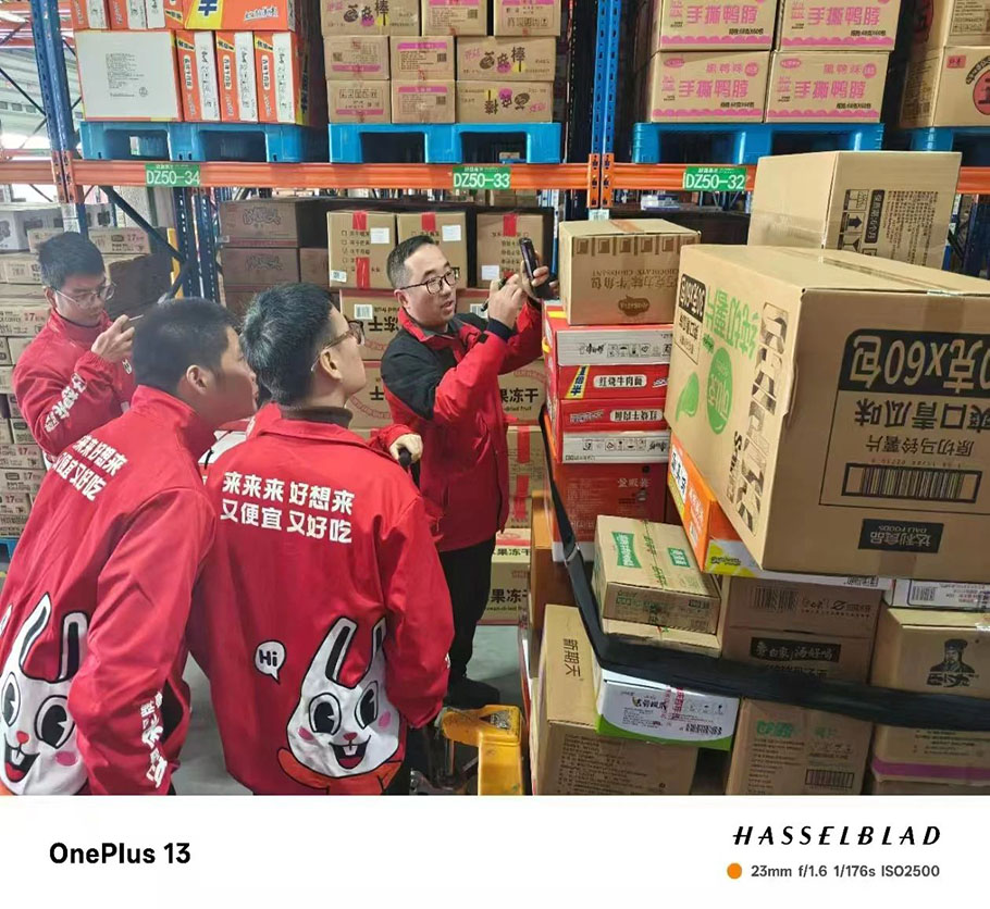 活动伊始,由好想来事业部负责人介绍了组织此次活动的目的和意义。德州仓2023年5月开仓至今,期间经历了多次大大小小的“战役”,为更好的保障服务时效,先后投入了先进化的码垛机、智能送货设备AGV、PDA拣货等。今年年货节,我们提前筹备,目前已经进行了多轮的年货节备货计划沟通,助力门店销售。本次活动的组织,主要是给大家提供了一个共同交流的平台,让我们能快速的响应问题、解决问题,真正为门店在年终的销售上提供强有力的保障。 参观交流 随后,在主持人的带领下,大家进仓参观了整个仓储配送的全流程作业环节。为更好的了解具体作业的流程,对参观人员现场分四个组在四个区域亲自体验了一把拣货工作,让大家认识到了PDA拣货的智能性,加深了对我们仓配服务的认可。 仓库介绍